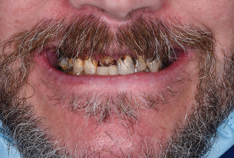 入れ歯についている歯の摩耗により、何年後かに入れ歯の修理、場合によっては作り替えが必要になる場合があります。治療内容 虫歯による痛みを感じながらも、歯科治療への不信感から長期間通院を控えていた患者様です。その結果、残っている歯の多くが重度の虫歯や歯周病により保存困難な状態となっていました。「もう入れ歯にして、きれいな歯で新しい人生を始めたい」という患者様の強いご希望のもと、総入れ歯での治療を行うことになりました。